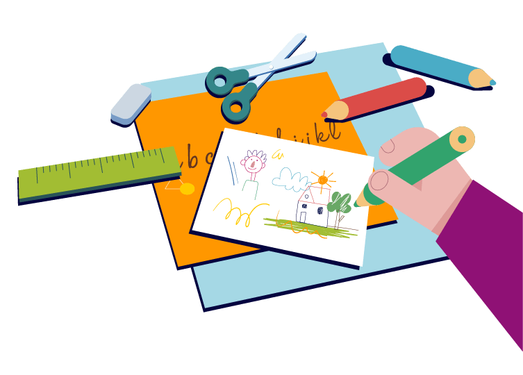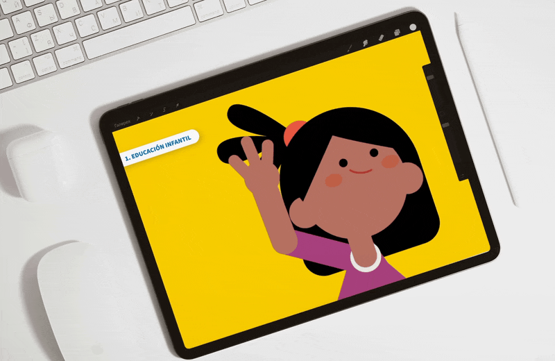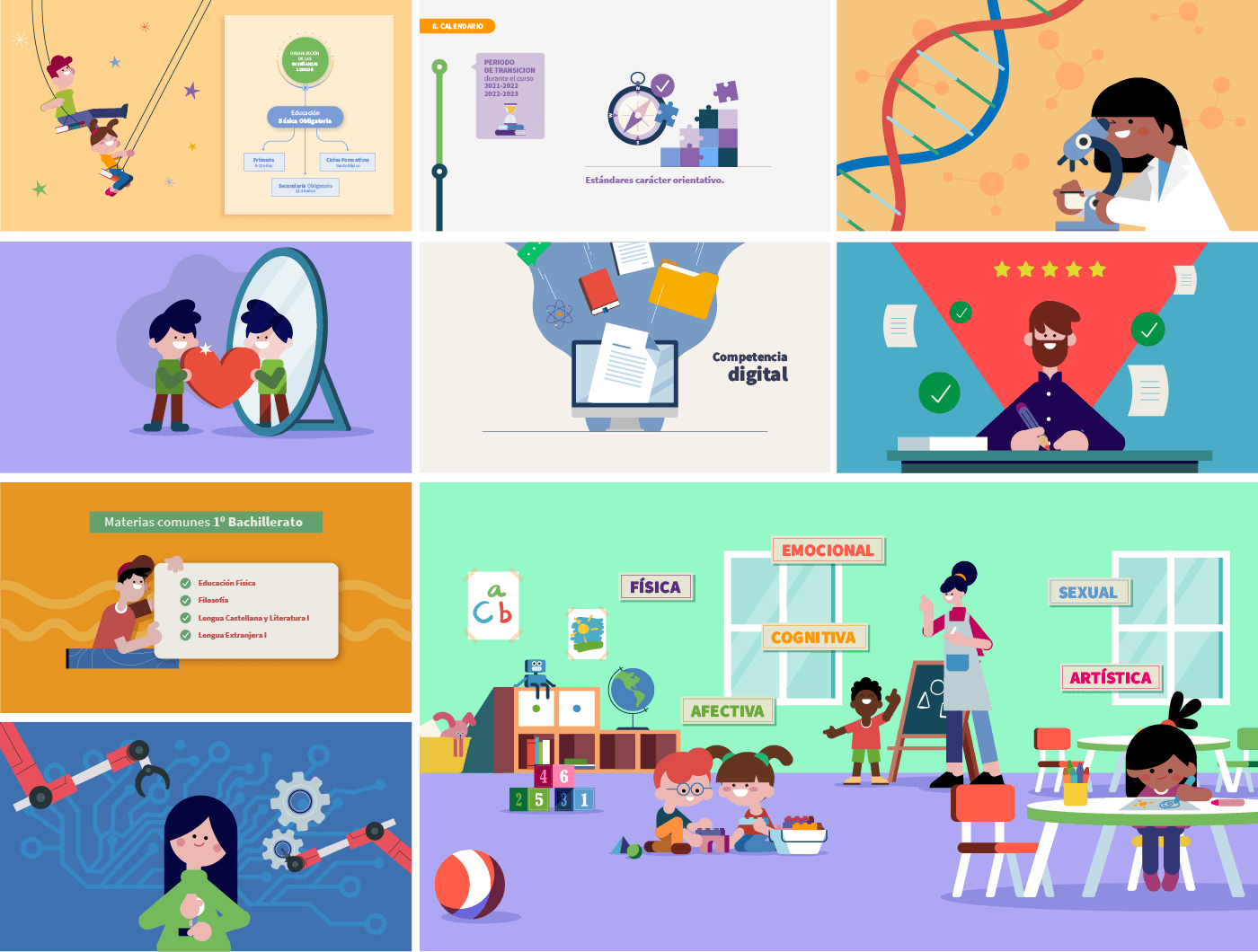 La propuesta se construyó a partir de un sistema de ilustración sencillo, claro y flexible, capaz de adaptarse a distintos bloques de contenido. Se combinaron personajes, iconos y pequeñas escenas para representar conceptos educativos, cambios legislativos y situaciones cotidianas dentro del ámbito escolar.